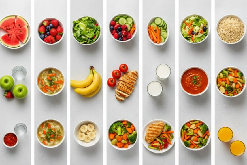 The first day focuses entirely on fruits, with an emphasis on water-rich varieties like watermelon, cantaloupe, papaya, and berries. Bananas are not allowed. This day jumpstarts detoxification and provides natural sugars and fiber while keeping calories low.